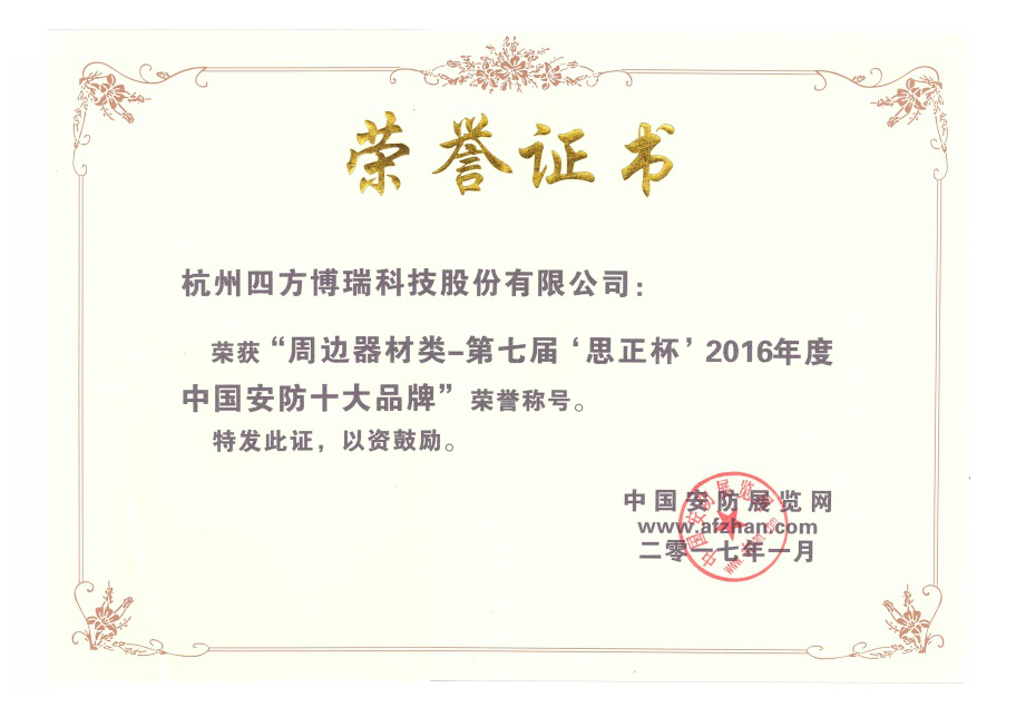 喜訊:四方博瑞獲第七屆‘思正杯'2016年度十大安防品牌-周邊器材類和創(chuàng)新產(chǎn)品獎(jiǎng)